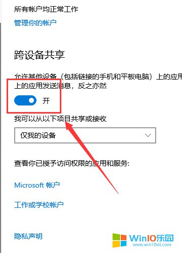 3、我们在新弹出的窗口右侧的找到“跨设备共享”这个按钮,然后打开“允许其他设备上的应用打开并开始此设备上的应用发送消息”这个开关。